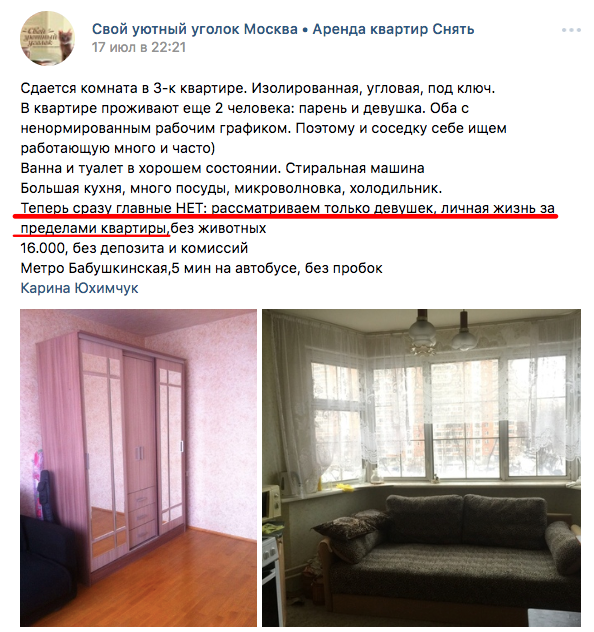 «Сдам на сутки койко место девушке 1000 рублей, в комнате будут находиться только два человека, для Вас большой диван на фото»