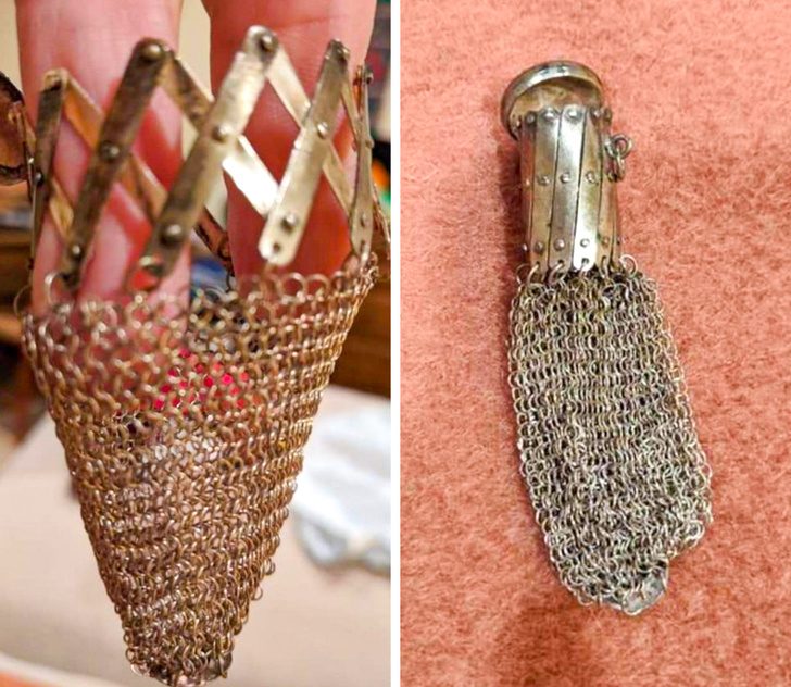«Приспособа для элегантного ношения перчаток. Их надо вставить в кольцо с зажимом, а цепочкой пристегнуть к сумочке.»