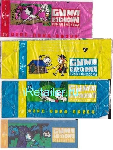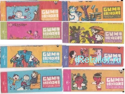 Это польская жвачка. Тоже упаковка с пятью пластинками, однако, с более интересными картинками. Называли мы их "смешинками". Они рассказывали о приключениях героев популярного тогда одноименного польского мультика. У моего старшего брата было много таких, а у друзей — не было. Видимо, эта жвачка была распространена в 70х-начале 80х.Мне ужасно нравились эти истории. Брат всегда шутливо звал меня Лёликом-болеком, поэтому я считал, что на картинках изображён я :)