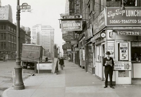 Житель Нью-Йорка читает газету, заголовок гласит: «Нацистская армия в 75 милях от Парижа, 18 мая 1940 года.