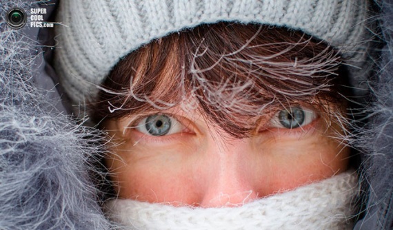 Девушка, укутавшись шарфом, смотрит на фотографа, Новосибирск, Россия.