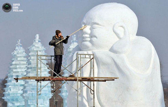 Мужчина полирует снежную скульптуру во время подготовки к Харбинскому международному фестивалю льда и снега, Харбин, провинция Хэйлунцзян, Китай.