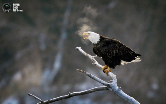 Белоголовый орлан сидит на ветви над рекой Де-Мойн (правый приток Миссисипи), штат Айова, США.
