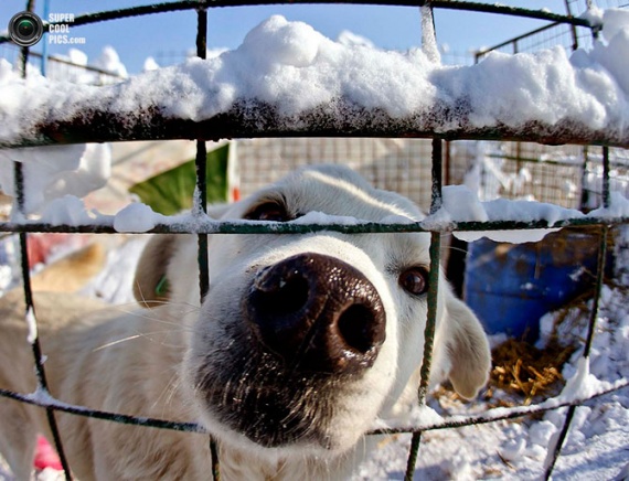 Пес пытается понюхать фотографа, просунув морду через забор приюта для бездомных животных, Глина, Румыния.