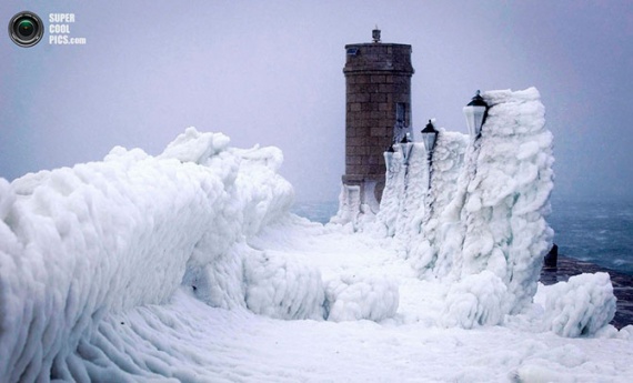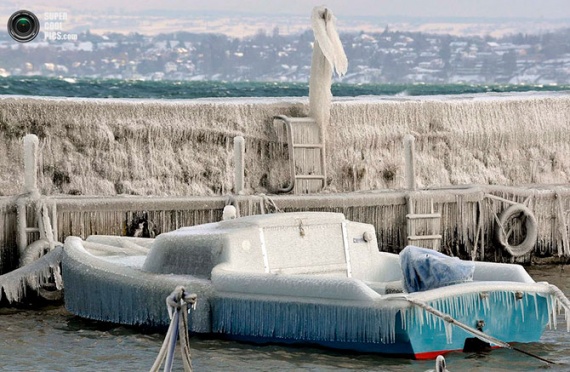 Покрытая льдом лодка качается на волнах у пристани Женевского озера, Версуа, Швейцария.