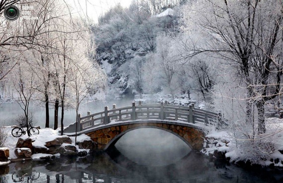 Мостик в заснеженном парке в Бэньси, провинция Ляонин, Китай.