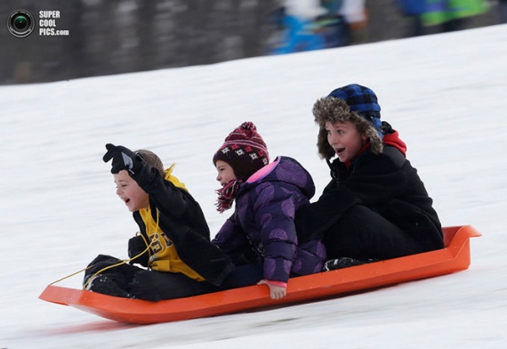 Дети съезжают на санках с холма в Индианаполисе, штат Индиана, США.