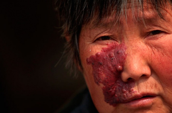 Жительница деревни Dongtan страдает от кожного заболевания, которое усугубилось с годами из-за загрязнения окружающей среды, возникшего в результате деятельности местного химического завода в городе Zekou в провинции Хубэй, Китай, 15 января 2013 года.