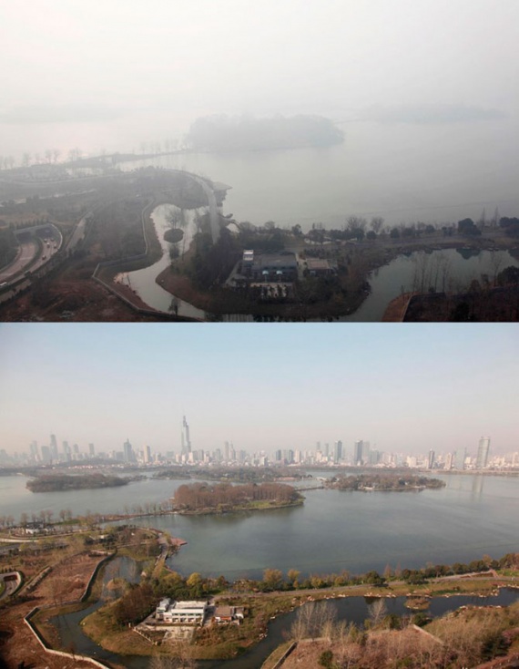 Туман над озером Xuanwu в городе Нанкин в провинции Цзянсу на востоке Китая 14 января 2013 года, и это же озеро в ясный день 31 марта 2012 года.