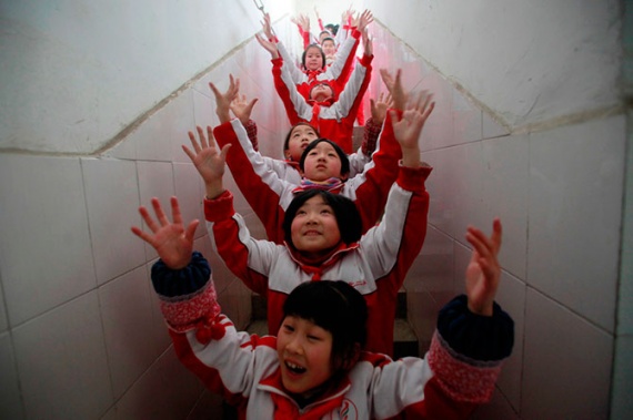 Дети занимаются физкультурой в здании школы в городе Цзинань в провинции Шаньдун, 14 января 2013 года. Власти порекомендовали местным жителям оставаться в помещениях, чтобы не дышать загрязнённым воздухом.