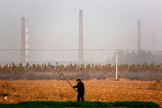 Фермер возделывает почву недалеко от дымящихся труб государственного завода по выплавке свинца в городе Tianying в провинции Аньхой, Китай, 19 ноября 2012 года.