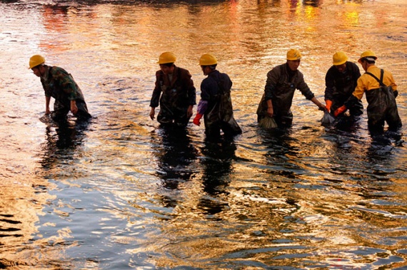 Рабочие чистят сильно загрязнённую реку Нанмин в округе Гуйян в провинции Гуйчжоу на юго-западе Китая, 17 ноября 2012 года.