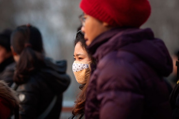 Женщина поправляет подруге защитную маску возле парка развлечений в Пекине, 12 января 2013 года. Степень загрязнения в столице Китая достигла опасного уровня. Власти рекомендовали гражданам не выходить из своих домов.