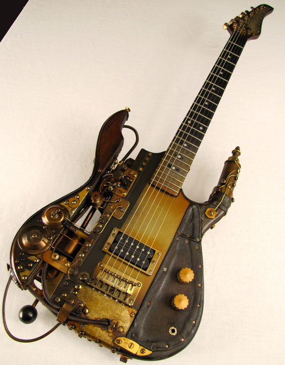 Любители музыки тоже не остались в стороне. Музыкальные инструменты подвергаются различным экспериментам, в результате которых появляется, например, эта гитара.Стимпанк стал модным движением, которое стремительно набрал обороты и превратился в тренд. И хоть паровые машины тяжелы, и зачастую малоэффективны, данное направление в искусстве вдохновляет на творческие подвиги, и неважно, профессионально ли это выполненный макет лошади или телефон из старых шестерёнок,- каждое такое творение, безусловно, приближает самого мастера и почитателей жанра к любимому миру. А это самое главное.