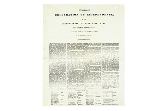 Цена: $884 000Декларация Бальфура считается первым шагом, первым документом на пути создания государства Израиль. 2 ноября 1917 года министр иностранных дел Соединенного Королевства Артур Бальфур направил лорду Ротшильду официальное письмо с просьбой передать его Сионистской федерации Великобритании. В нем говорилось о возможности создания национального очага для еврейского народа на территории Палестины. В июне 2005 года на аукционе Sotheby’s в Нью-Йорке на продажу были выставлены материалы из архива одного из лидеров сионистского движения сэра Леона Симона. Среди ценных исторических документов оказалось и два оригинала проекта Декларации Бальфура.Декларация о независимости Техаса