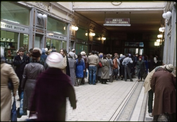 А эта очередь — в кондитерский магазин. Видите — там больше женщин. В этом магазине несколько раз в неделю привозили наборы маленьких пирожных и шоколадно-вафельных тортов. Это считалось очень дефицитными и вкусными продуктами. Я тоже там стояла. Сейчас, к большому счастью, я могу это все купить в любом магазине. И даже — не покупаю вообще. Потому, что сладок только запретный плод:)