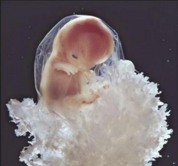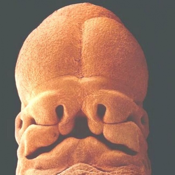 Пятинедельный эмбрион, длина 9 мм, уже угадывается лицо с отверстиями для рта, ноздрей и глаз.