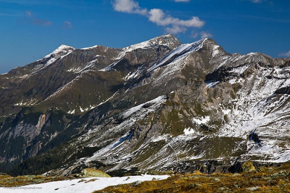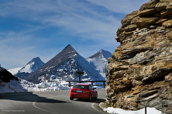 Дорога получила свое название в честь самой высокой горы Австрии — Гроссглокнер, высота которой 3798 м. Вот она впервые появляется в поле зрения (заснеженный пик):