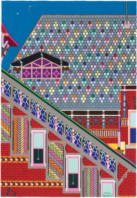 «Панорама Лондона»Он воссоздает панорамы городов исключительно по памяти. Для создания своих шедевров художник использует исключительно шариковые ручки, высококачественную бумагу и айпод, т.к. музыка помогает ему сконцентрироваться и не отвлекаться от процесса рисования.Психолог, педагог и поведенческий аналитик Джилл Маллин (J. Mullin) собрала в книге «Нарисованный аутизм» (Drawing Autism) произведения этих необычных художников. Помимо работ заслуженных авторов, книга содержит картины неизвестных, но талантливых художников, а также рисунки детей с расстройствами аутического спектра.