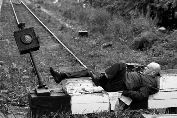 Это «Домодедово» аэропорт, 70-е годы. Я бегу от электрички к зданию аэровокзала. Была плохая погода, и долгое время самолеты не летали, и поэтому все неулетевшие рассосались по аэропорту и вокруг. Человек на снике — не улетел, он спит вот в конце этого железнодорожного «путя».В первый раз