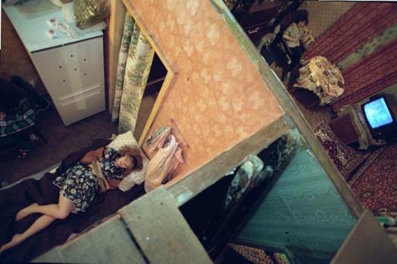 Конец 80-х — начало 90-х. Коммуналка. Выглядит как декорация на «Мосфильме», где строятся временные перегородочки, изображающие какую-то жизнь. Но это вполне себе реальная квартира.Меня попросили снять тему про коммуналки. Я не только в одной этой квартире был, а напряг всех своих знакомых, которые знают или имеют знакомых, живущих в коммунальных квартирах. Но вот эта меня совершенно поразила. В кадре — большая комната одной семьи. Там вот в углу сидит мать, внизу под нами это ее дочка весьма милая. Они просто разгородили эту большую комнату фанерной перегородкой, чтобы как-то отделиться друг от друга. Но разгородили не до потолка, а до середины, и поэтому можно было забраться на эту перегородку, и оттуда сделать такой кадр. Помню, пылища там не протиралась, я думаю, полгода или год, слез я оттуда весь в какой-то паутине, пыли, черте в чем.Символ эпохи