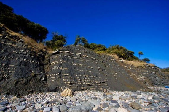 Лайм Реджис — Пляж Юрского периода Пляж Юрского периода расположен в английском графстве Западный Дорсет, недалеко от селения Лайм Реджис. Конечно, здесь нет динозавров, но прибрежные скалы содержат множество окаменелостей древних моллюсков аммонитов. По оценкам специалистов возраст окаменелостей составляет более 185 000 000 лет. В результате частых оползней на поверхности появляются все новые и новые останки древних обитателей планеты и чтобы их обнаружить, можно обойтись без специальных археологических раскопок. Что, безусловно, очень удобно.
