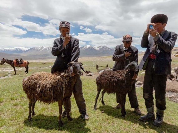 5. Киргизские пастухи с мобильными телефонами, которые они купили и заряжают с помощью солнечных батарей. Хотя телефоны бесполезны для общения, ими пользуются, чтобы слушать музыку и делать фотографии. (Matthieu Paley)