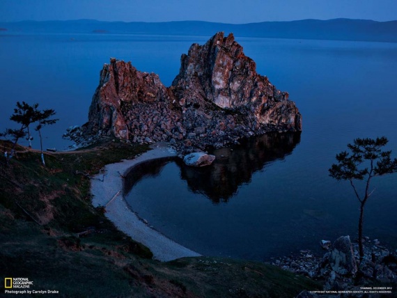 14. Вершины скалы Бурхан, словно башни-близнецы, торчат из озера Байкал – крупнейшего пресноводного водоема. Люди по всей Азии верят, что духи Байкала живет в этой скале на острове Ольхон, куда стабильно совершают паломничества. (Carolyn Drake)