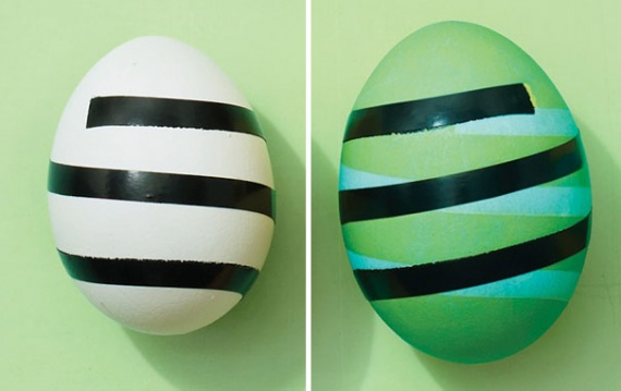 Чтобы получить такой узор, нужно поочередно покрасить яйца в различные цвета, каждый раз приклеивая новую пленку.Кружево
