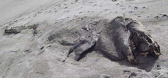 По словам Элизабет, 30-футовая (10 метров) изуродованная туша морского чудовища имеет огромную голову, зубы и рудиментарные ласты. Она также отметила, что внутренности монстра, вероятно, пострадали от атаки.