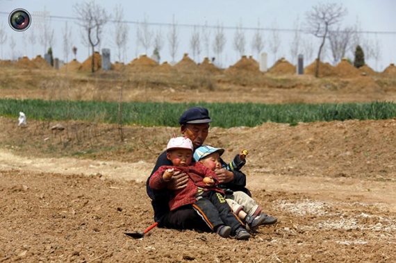 Пожилой крестьянин держит на руках своих внуков во время посадочных работ в поле на окраине города Вэйфан в провинции Шаньдун.