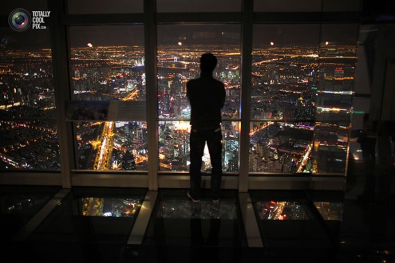 Мужчина любуется ночным Шанхаем из окна Шанхайского всемирного финансового центра.