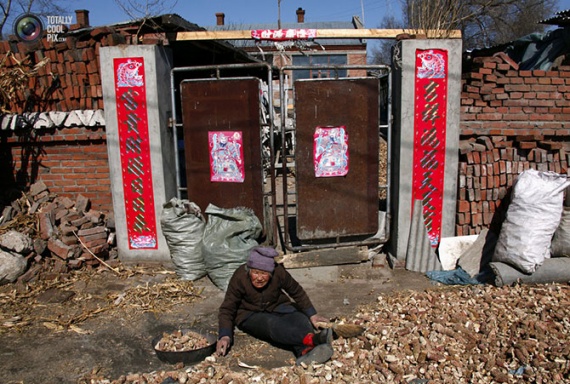 92-летняя женщина сортирует кукурузу возле своего дома в деревне Цзяньхуа. Она продаёт кукурузу местному предприятию, чтобы заработать дополнительные средства на жизнь.