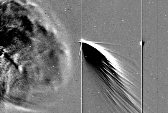 Это Pan-STARRS — непериодическая околосолнечная комета. В марте 2013 года её можно было наблюдать невооружённым глазом, при этом она находилась вблизи перигелия. Названа она в честь телескопа системы Pan-STARRS, расположенного на острове Мауи (Гавайи).Эта фотография кометы сделана 15 марта 2013 с аппарата Stereo Behind, являющегося частью одного из самых необычных проектов по изучению Солнца. Так, один аппарат движется по орбите, расположенной к Солнцу чуть ближе земной, другой — чуть дальше. В результате Stereo Ahead и Stereo Behind присылают снимки, сделанные с различных точек одновременно. Это позволяет формировать трехмерную картину наблюдений.