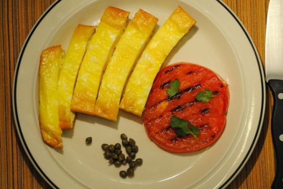 "Советский омлет" из духовки (яйца, молоко, соль), "гриленый" помидор и каперсы.