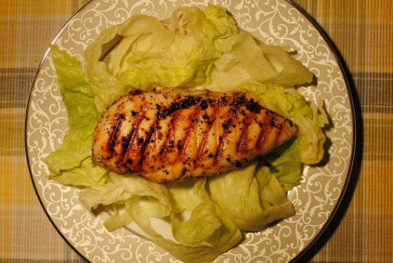 Куриные грудки были замаринованы на ночь в водном растворе соли, сахара, красного копченого перца, цедры апельсина и орегано. Жарить на сковородке-гриль 3 минуты с каждой стороны.