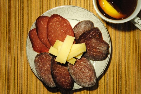 Советский завтрак."Нарезка" и сладкий чай с лимоном.