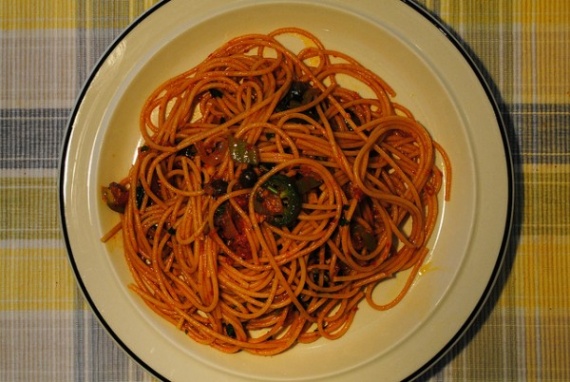 Хотя многочисленная литература о возникновении свежей "пасты" пестрит ссылками на путешествие Марко Поло в Китай, первое задокументированное упоминание этих изделий из пшеничной муки, воды и яиц обнаружено в персидской литературе 10-го века. Существует также гипотеза, что древние греки знали пасту под именем "итрия", но какая она была, как готовилась и как варилась (жарилась) до сих пор нет ясных свидетельств. Персидскую пасту называли "лакхша", что означало "скользкая" — в бытовых описаниях тех лет, рассказывается как люди всасывали ее в рот:) Точь-в-точь, как сегодняшние ребятишки в детском саду. Слово это было в употреблении на протяжении 4-х столетий, но уже в 14-м веке практически полностью исчезло из употребления. С тех пор, как персы, так и арабы используют слово "ришта". Забавно, что перед тем как полностью исчезнуть на Ближнем Востоке, слово лакхша переместилось (вслед за скупщиками пушнины и татаро-монголами) на территории занимаемые в последующем Советским Союзом. Это северо-кавказская лакса, украинская локшина и русская лапша.Паста и томатный соус (помидоры, петрушка, жгучий зеленый перец, чеснок, лук, оливковое масло, каперсы и соль).