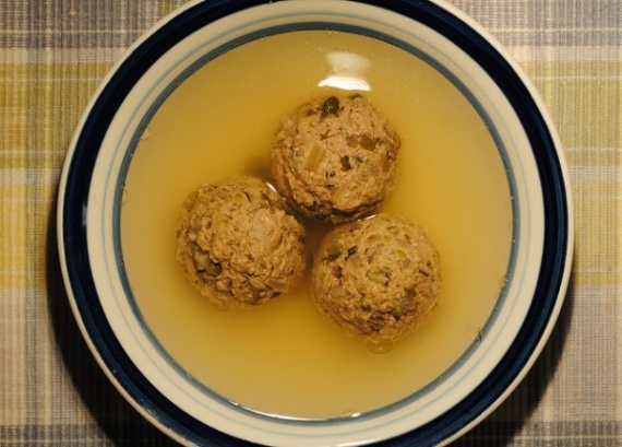 В Забайкальском стиле.Крепкий бараний бульон из холодильника. Фрикадельки из говяжьего фарша+лук+соленые огурцы+каперсы+черный перец и соль. С момента закипания варить 5 минут.