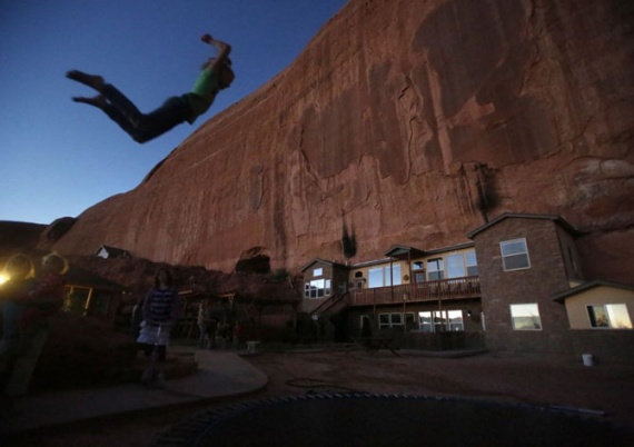 Девушки прыгают на батуте возле домов, встроенных в скалу на ранчо Рокланд в Моаве, Юта. В городке, который местные жители называют «Скала», проживает около 100 человек, приблизительно 15 семей. Тут проживают семьи множенцев-мормонов, которые поселились на этом месте с середины XIX века.