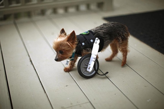 Йоркширский терьер из Колорадо пользуется компактным инвалидным жилетом для одной конечности. Чтобы привыкнуть к новой искусственной «лапе», животным требуется от нескольких дней до нескольких месяцев — в зависимости от серьезности повреждения и сложности устройства протеза.