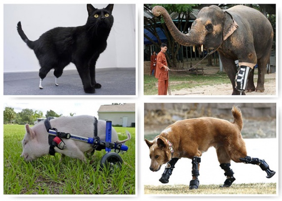 Часто собаки, кошки и другие представители фауны, которые лишились возможности самостоятельно передвигаться, получают поддержку в виде инвалидных тележек на колесиках. Но иногда изобретательные врачи и просто энтузиасты придумывают для зверей-инвалидов и более сложные протезы.Самка дельфина по кличке Фуджи потеряла 75% своего хвостового плавника в 2002 году. Что именно стало причиной этого, не установлено. Специалисты подарили Фуджи, живущей в океанариуме Окинавы, хвост из гибкого материала. Подвижный хвост помог самке вновь начать быстро плавать. Ветеринары заявили, что она стала первой дельфинихой, которая обзавелась искусственным хвостом.