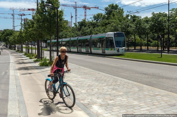 А это похожая улица в Москве. ул. Народного Ополчения. Она могла бы стать такой, как улица в Париже. По ней мог бы ходить трамвайчик, который связал бы Сокол, Октябрьское Поле с Крылатским. Жители могли бы удобно и быстро добираться куда им нужно.