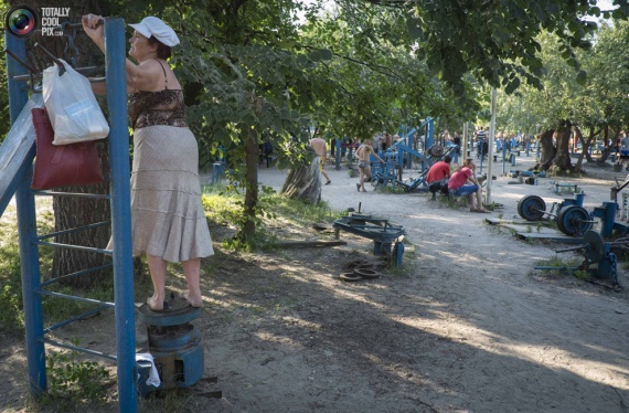 15. Женщина разминается в качалке на берегу Днепра в Киеве.