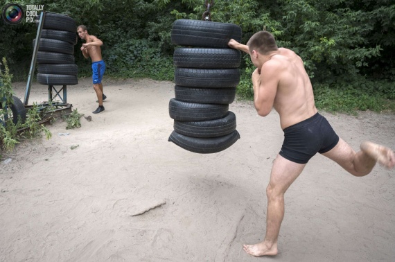 10. Автомобильные шины здесь применяются в качестве боксерских груш, а гантели закреплены цепями, чтобы не украли.
