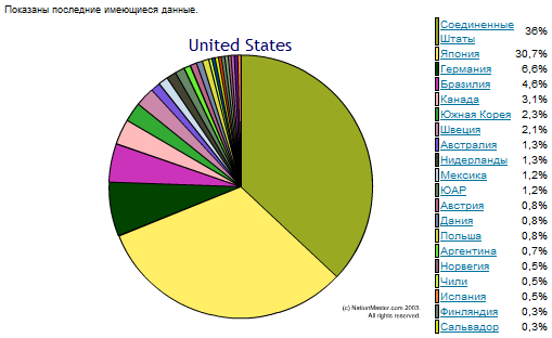 4 Объем потребления сладкой газированной воды на 1 человека. В среднем каждый американец высасывает в день примерно 0,5л газировки5 Производство фастфуда В 2000 году, потребители США потратили около $ 110 млрд. на фаст-фуд, а в 1970 всего 6 млрд.6 28 часов — время, которое средний американец тратит на просмотр телевизора в неделю. Здесь первое место США пока делит с Британией. Есть куда стремиться.7 Объемы мошенничества с кредитными картами 27% от общей суммы украденных денег с кредиток в мире приходится на США. $ 3,56 млрд. за 2010 год.8 Количество холостяков и холостячек 26% от общего количества домохозяйств в США представлены только одним человеком9 Процент разводов 4,95 на 1000 человек, но если привести статистику к количеству браков, то на первом месте окажется Бельгия — почти 60% разводов на 100 свадеб.10 Количество случаев подростковой беременности Процент забеременевших девушек моложе 20 лет.