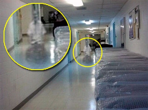 13. Это привидение с «инвалидным креслом» сфотографировала в подвале сотрудница дома престарелых «Kith Haven» города Флинт (Мичиган). Она говорит, что видела его собственными глазами: мужчина в белой рубашке везёт в инвалидном кресле женщину. Её голова наклонена вправо.
