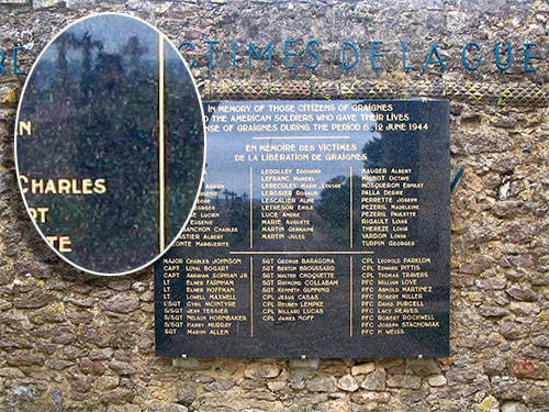 3. «В 2008 году мы с женой отдыхали в Нормандии и посетили старое кладбище и руины собора в Гренье. Я сделал единственную фотографию мраморной плиты с именами американских десантников и французских граждан, погибших в этом месте в 1944 году. Снимок был сделан на цифровую камеру, и я не просматривал его, пока не вернулся домой в Канаду. К своему удивлению я увидел по правую руку от меня фигуру солдата. Любопытно, что солдат оказался чёрно-белым, хотя сам снимок цветной. Я уверен, что в тот момент никого кроме нас с женой на кладбище не было. Мне кажется, что форма солдата похожа на ту, что носили во время Первой мировой войны – с фуражкой и двумя рядами пуговиц на кителе».