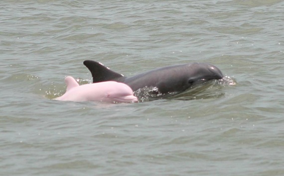 Розовый дельфинВ июне 2004 года в сети появились снимки розовой афалины — дельфина альбиноса, плывущего вдоль озера в штате Луизиана. Снимки были сделаны капитаном Эриком Ру.