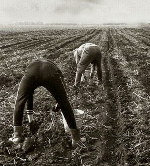Однако гораздо чаще по полю просто ехал трактор с плугом и неряшливо выворачивал клубни на поверхность. Следом брели фигуры с пустыми мешками и, наполнив их на три четверти, оставляли стоять, а сами шли дальше. Другие волоком стаскивали мешки в группы, где самые умелые скручивали их горловины и накрепко обвязывали веревкой.